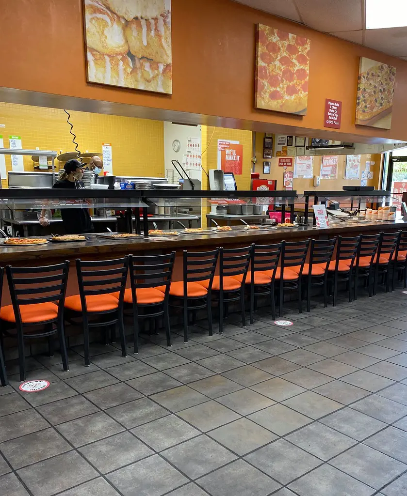 Upon entering the restaurant, one is immediately greeted by the tantalizing aroma of freshly baked pizza dough, a siren's call that draws you toward the heart of the self-serve station. The buffet is a sight to behold, with an endless stretch of pizzas decorated with an array of toppings.