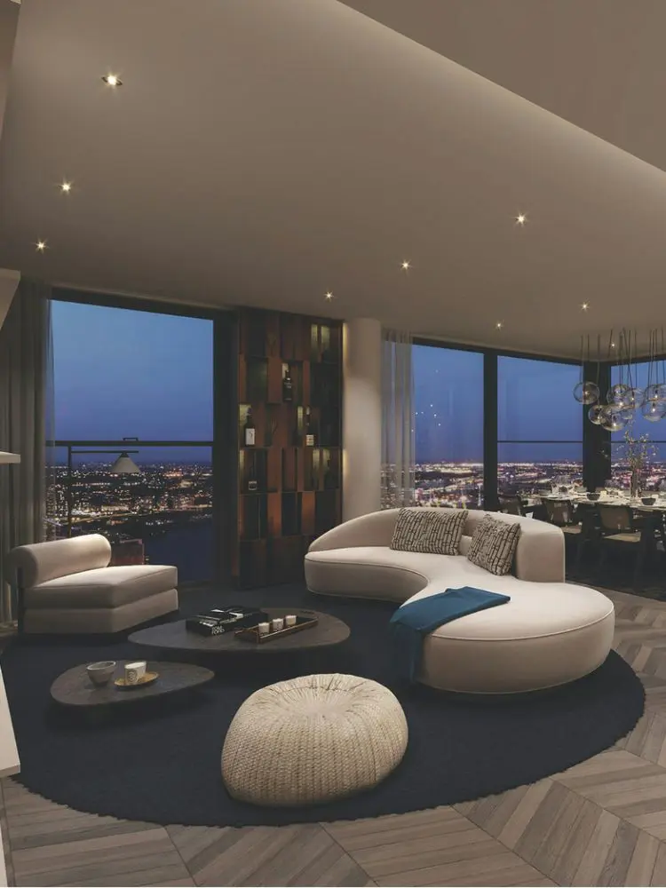 When guests arrive at the Rolls-Royce Phantoms, a Champagne walk-and-talk check-in awaits them. Floor-to-ceiling windows, jewel-tone colors, shape-defying seating that invites in-depth conversation, blue-chip art, customized bars, and art deco-inspired bathrooms with waterfall steam showers are all highlights of each SkyVilla.