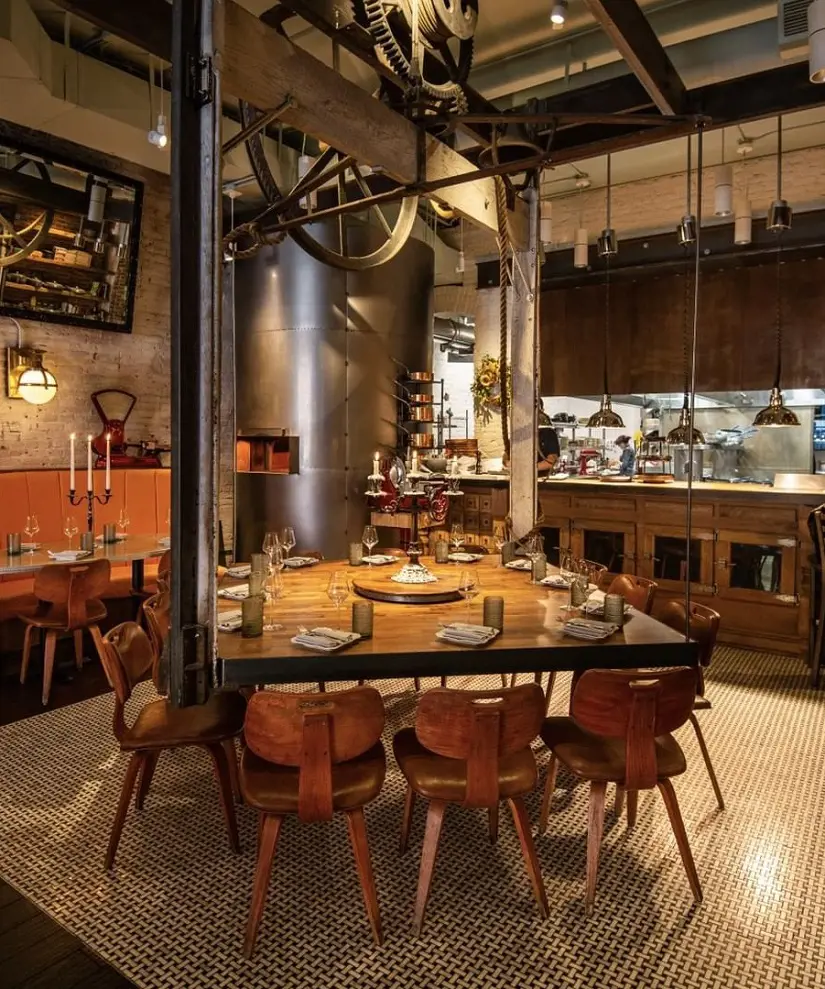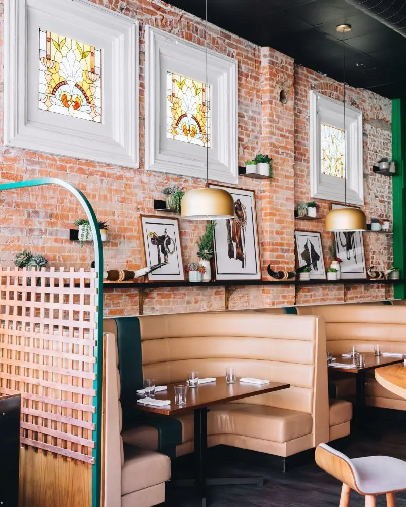 The industrial-chic design with exposed brick and towering ceilings gives a modern edge, while warm lighting and greenery create a cozy ambiance.