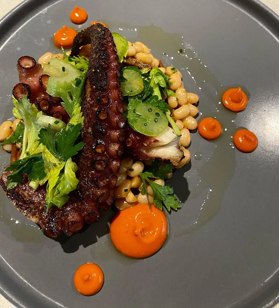 At Rioja, you're at a treat, whether it's the best food, great wines, or the cozy ambiance. Start with some Rioja House Salad, followed by seared salmon and grilled octopus.