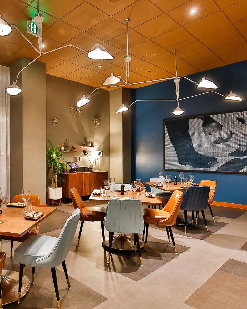 The dining room is a feast for the eyes, with sleek modern decor and pops of color that echo the vibrancy of the food.