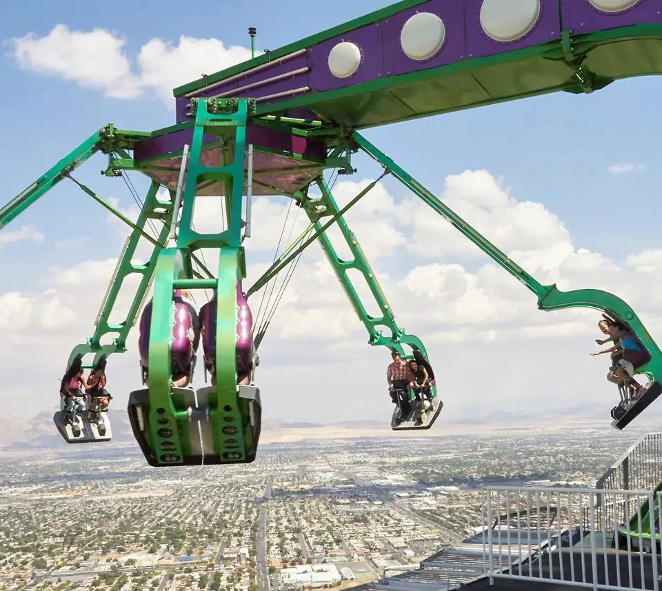 Are you ready for a 90-degree incline at EI Loco, which will last for 1 minute and 13 seconds? At the apex of its swing, the car reaches an astounding height of 400 feet above the ground, surpassing even the observation deck of the Stratosphere Tower.