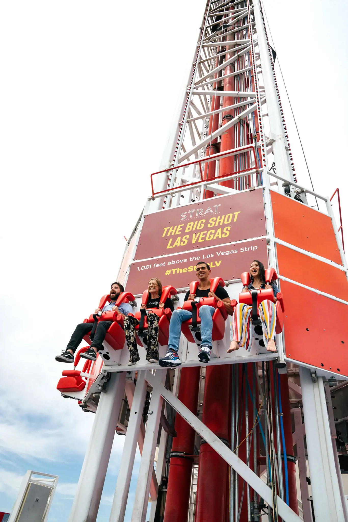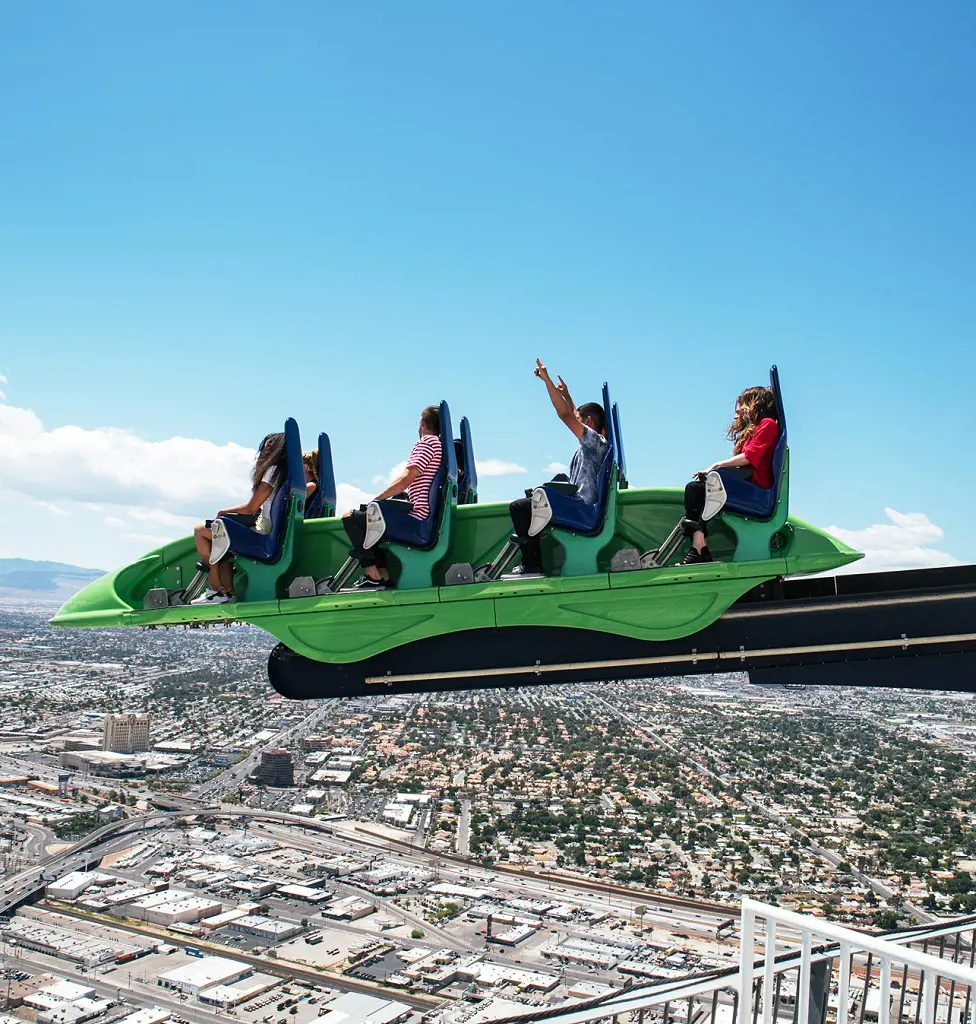 As riders board the open-top car, a sense of anticipation mingles with a touch of trepidation. With a sudden jolt, the car is propelled forward, gaining speed along a 68-foot track. The edge of the tower looms closer, and the city lights of Las Vegas stretch out beneath, a mesmerizing spectacle.