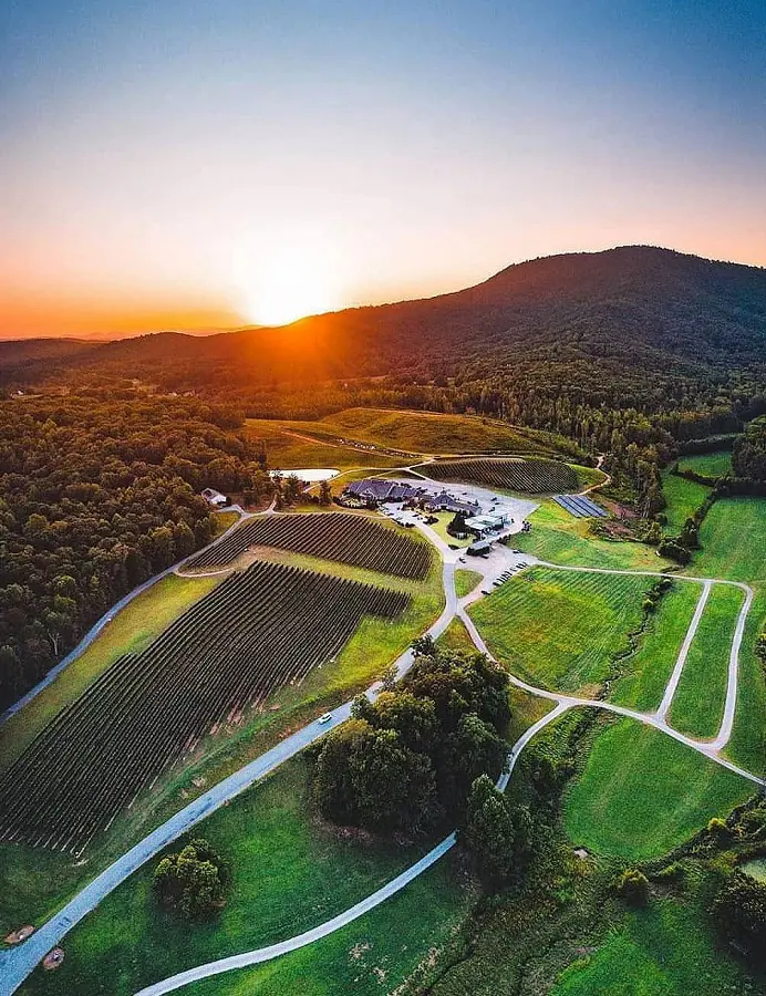 Enjoy breathtaking scenery and exceptional wines at Yonah Mountain Vineyards. Inside, you'll find an octagonal bar and ceiling, offering stunning vistas of the vineyard, along with a warm fireplace, and local artwork.