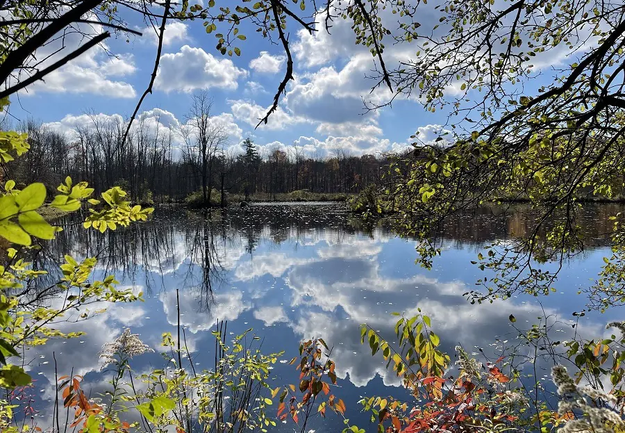 The trails here include wetlands, pond edges, forests, and old fields. It also follows boardwalks and mulched paths.