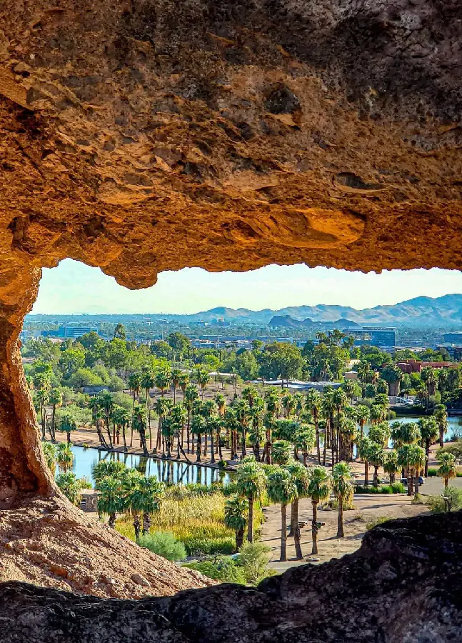 The trails include an interpretive nature trail to learn about Sonoran Desert flora and fauna, and a short hike inside Hole-in-the-Rock. the park's most scenic viewpoint. The east side of the park features a main chamber that looks out nearby lagoons and distant downtown skyline, perfect during sunset.